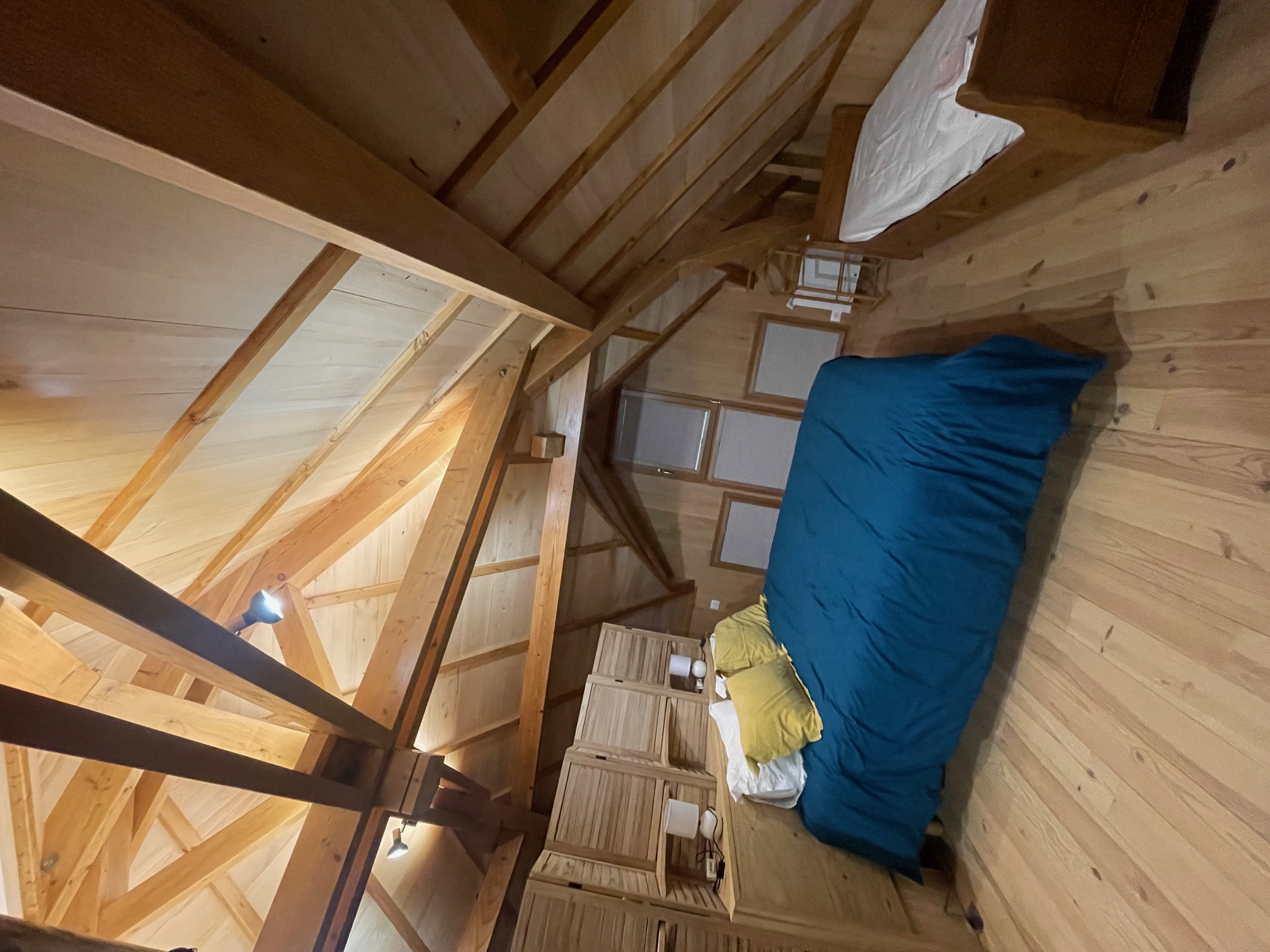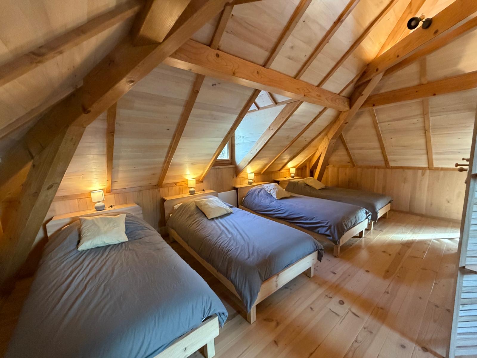 À l'étage, un grand dortoir (1 lit 160 + 4 lits simples) avec bain et toilettes.